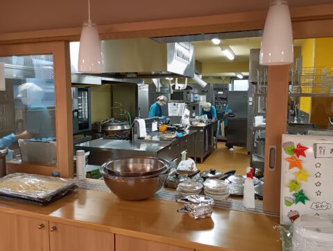 つくる人の顔が見える、つくる人の心のぬくもりが伝わるような食事を、友だちと共有し合って食べることが、とても大切だと考えています。窓越しに見える調理室の仕事や、ただよってくる美味しそうなにおいに、食事に対する期待や関心も高まります。