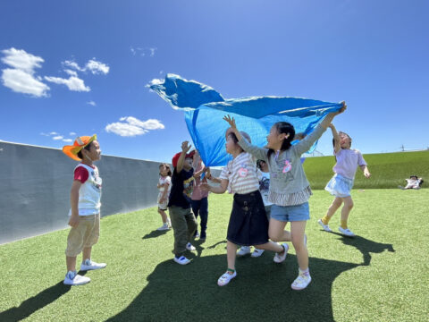 保育理念「あそんでまなぶ、まなんであそぶ、かぜのこ みどりっこ」のもと、子どもたちの好奇心を大切にし、自然、アート、音楽、運動などを通して、あそびの中にこそたくさんの学びがある、そんな生活です。異年齢保育も行っており、年下の子を助けたり、年上の子から学んだり、あそびや生活の中で子ども同士の豊かな交わりがつくられます。