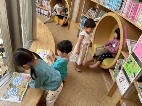 園庭には、ツリーハウスやウッドデッキが設置され、子どもたちが自由に走り回り、自然と触れ合える環境が整っています。また、「空飛ぶ図書館」と呼ばれる空中に浮かんだような図書室では、たくさんの絵本や図鑑が揃っており、好きな本のページをめくりながら、ゆっくりと過ごすことができます。